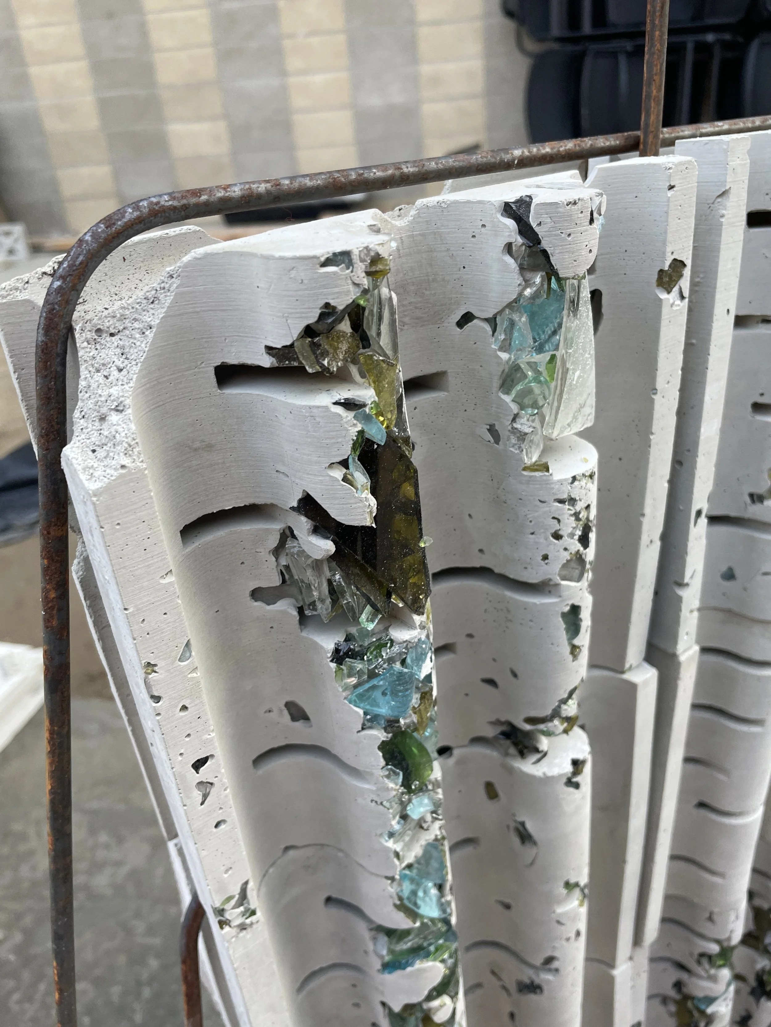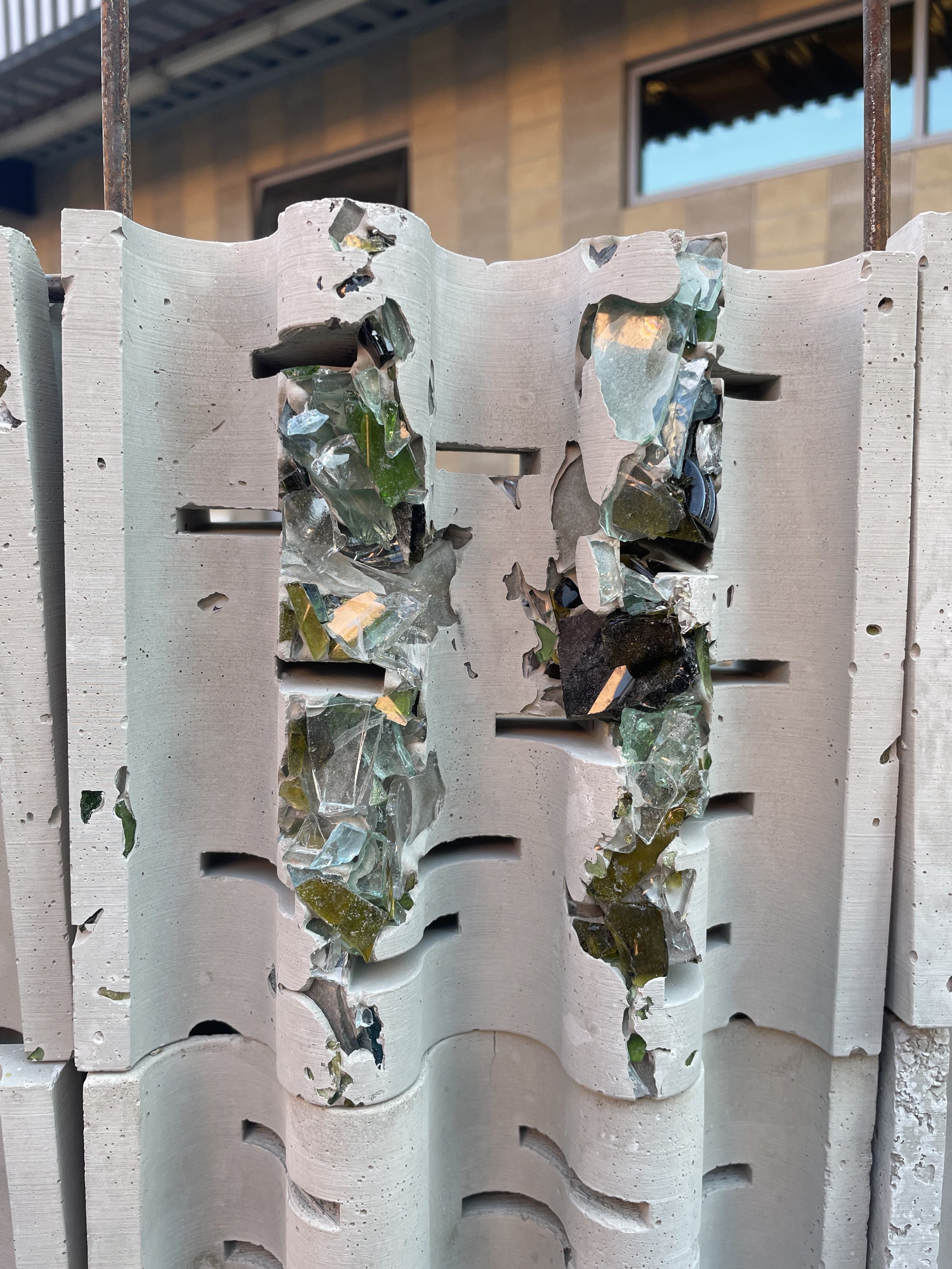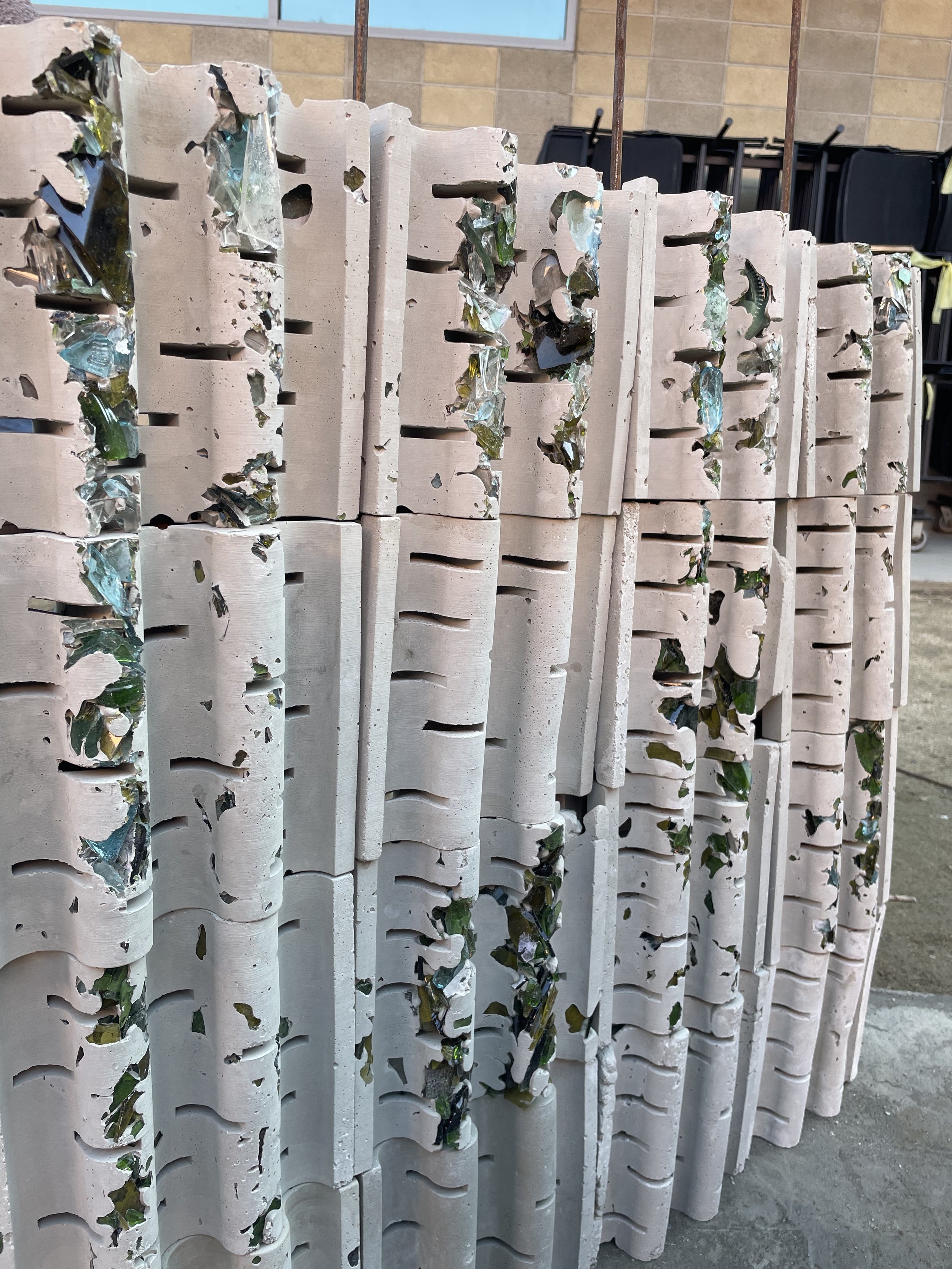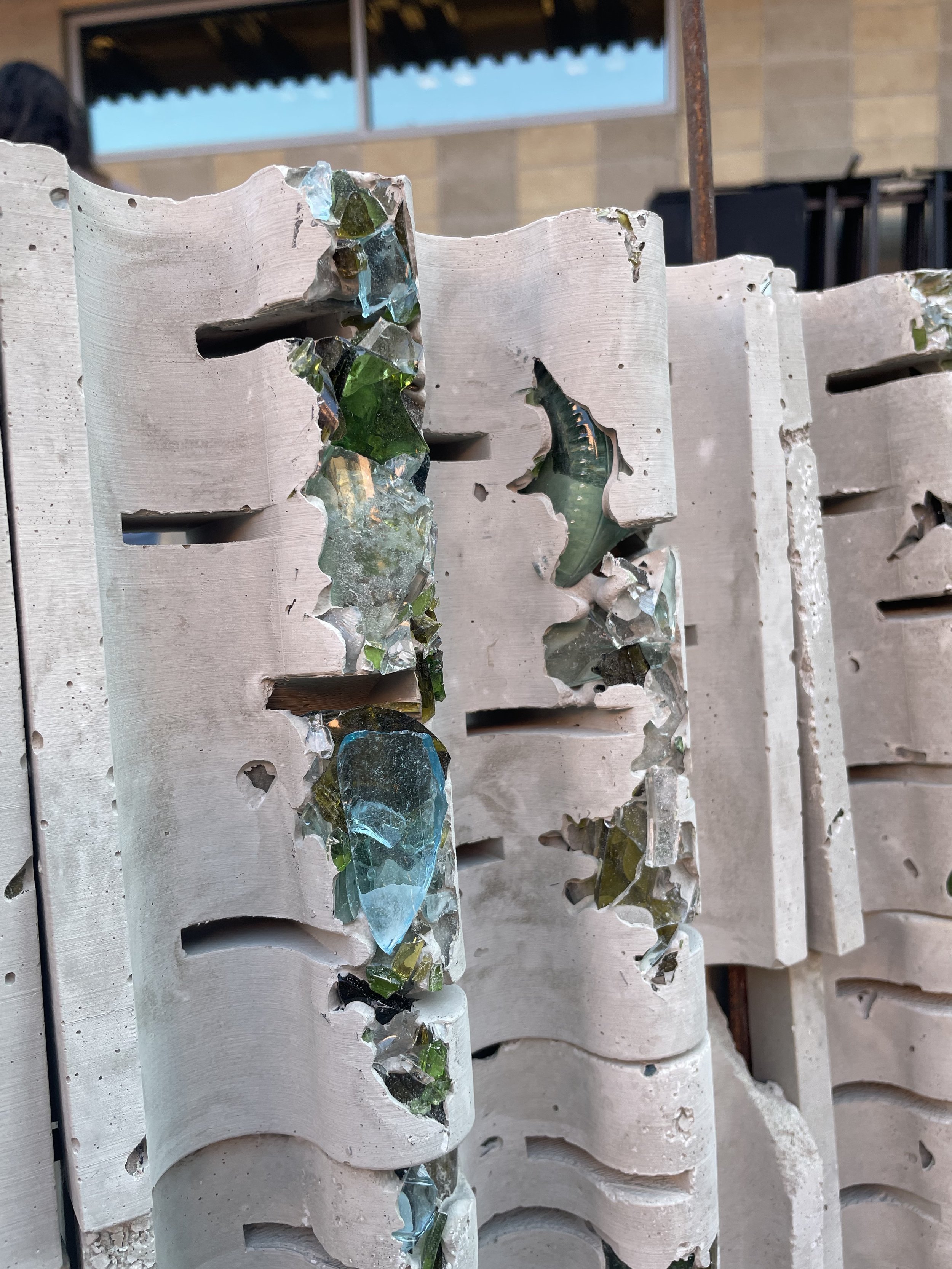 Sea Glass was created for an alternative to the original concrete mixture to create a more environmentally sustainable alternative. When looking into the idea of Terrazzo, the idea of using more aggregate, therefore less cement within the ratio, allows for the mixture to be more environmentally sustainable. Within the course, we explored various aggregate mixtures and then choice the one we thought worked best to create several textile blocks to create a textile block wall to showcase our environmentally sustainable alternative to the original Frank Lloyd Wright concrete textile block.