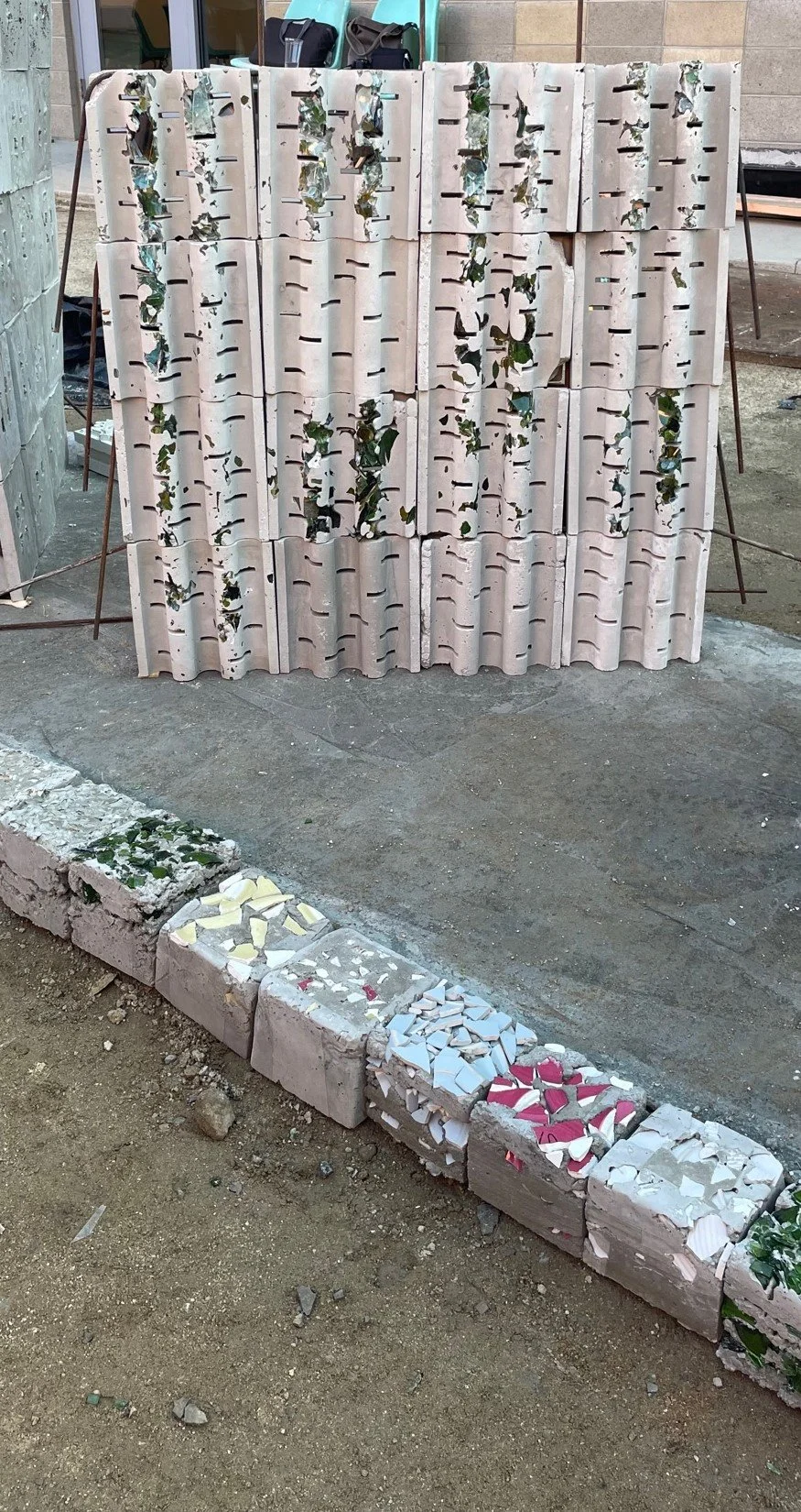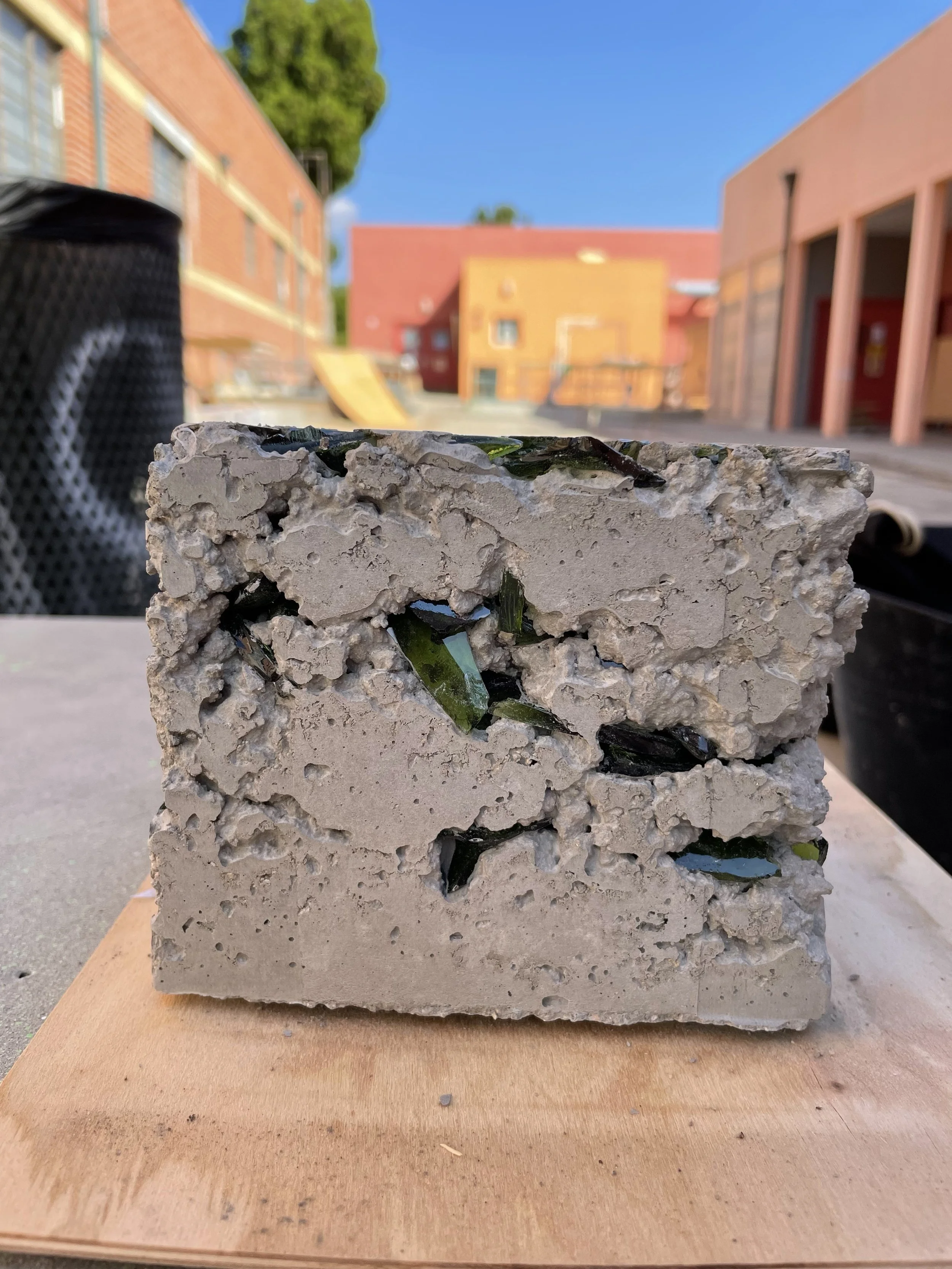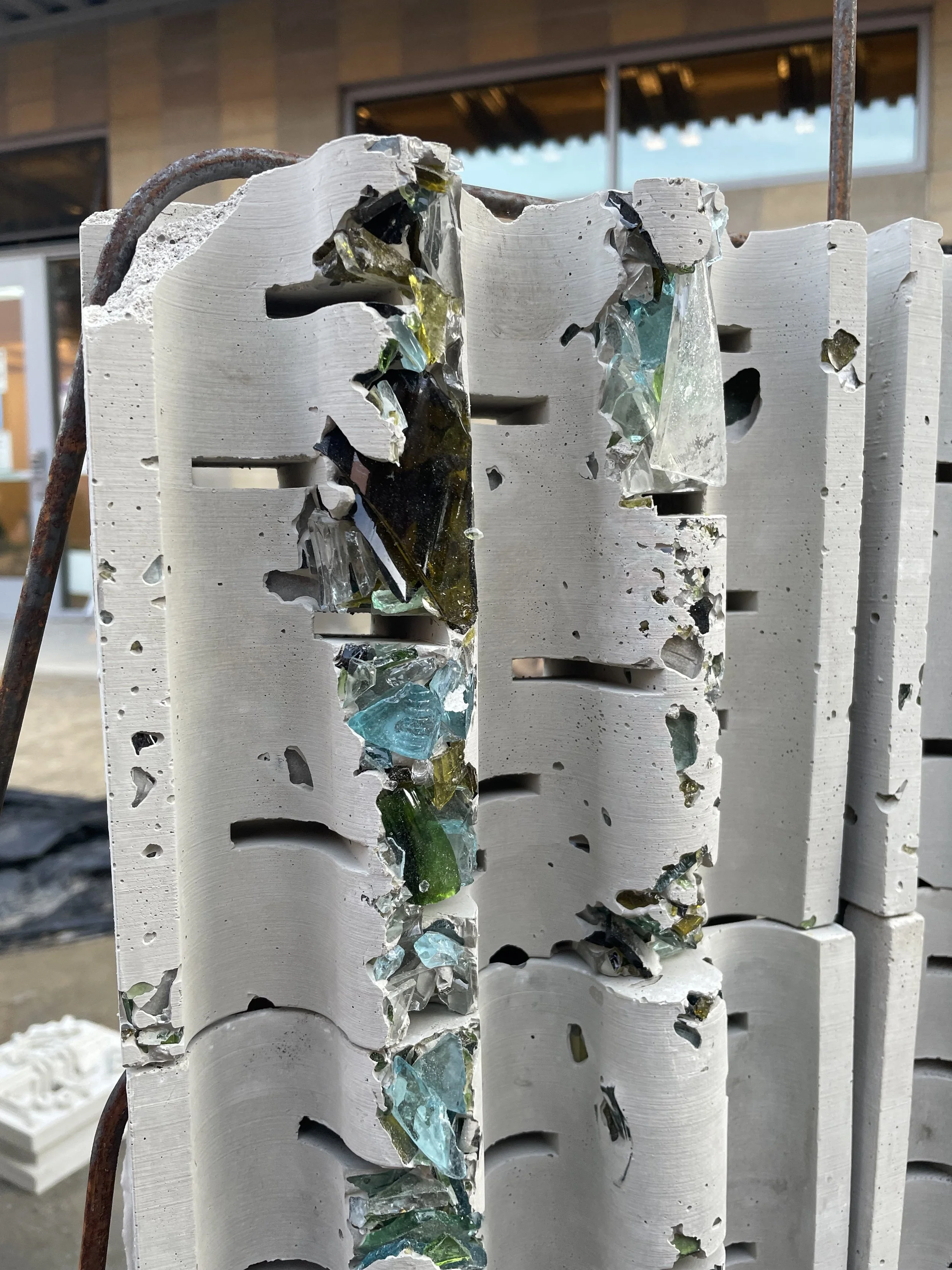 Sea Glass was created for an alternative to the original concrete mixture to create a more environmentally sustainable alternative. When looking into the idea of Terrazzo, the idea of using more aggregate, therefore less cement within the ratio, allows for the mixture to be more environmentally sustainable. Within the course, we explored various aggregate mixtures and then choice the one we thought worked best to create several textile blocks to create a textile block wall to showcase our environmentally sustainable alternative to the original Frank Lloyd Wright concrete textile block.